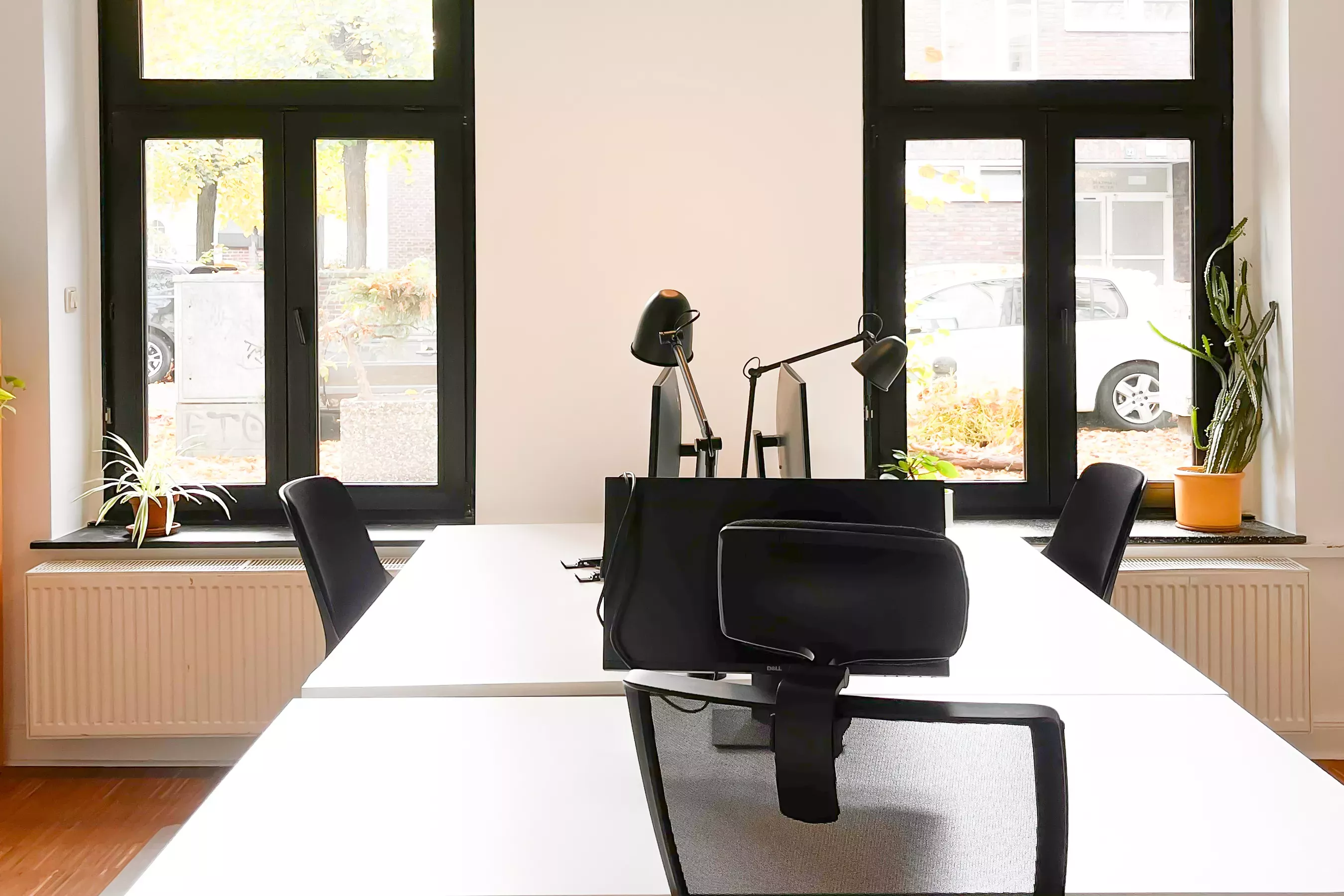 Wir vermieten den ganzen Raum für 600 € mit Aufschlag für die gemeinsame Nutzung von Geräten/Möbel oder ab 200 € pro Schreibtisch.